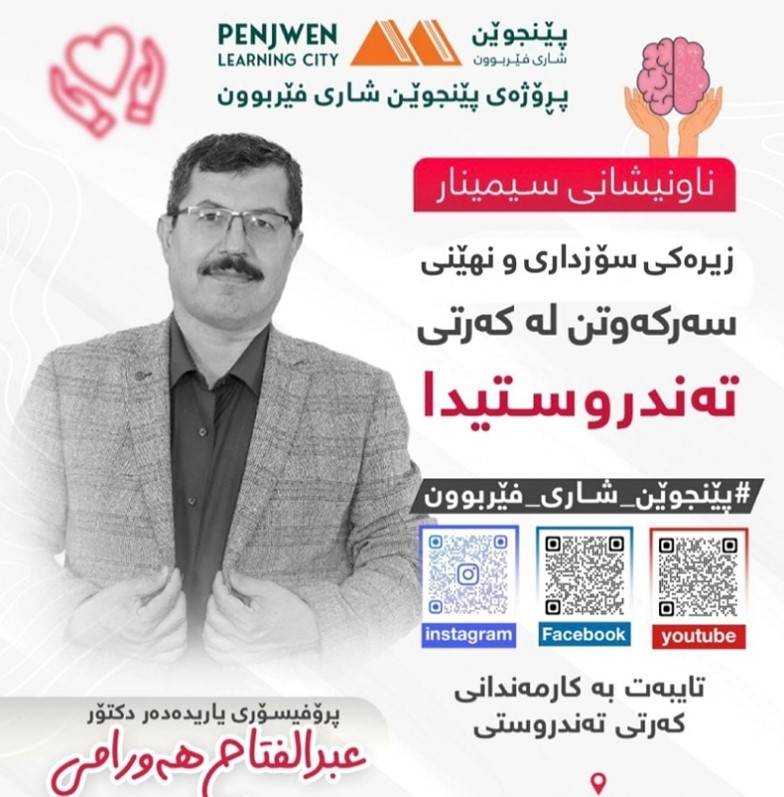 پڕۆژەی پێنجوێن شاری فێربوون سیمینارێکی تایبەت بە منداڵان و نەوجەوانان، بۆ بەڕێز (هەتاو عزیز) بە ناونیشانی (گۆڕینی یاریە ئەلکترۆنیەکان بۆ یاری دەرونی) سازدەکات، بەمەبەستی هۆشیار کردنەوەی چینی نەوجەوانان و منداڵان لە و گرفت و کێشانەی کە لە ئەنجامی زۆر بەکارهێنانی یاریە ئەلکترۆنیەکانەوە ڕوبەڕویان دەبێتەوە.شوێن : کتێبخانەی گشتی پێنجوێن - نهۆمی دووەم.کات : ۹ ی پێش نیوەڕۆ ڕۆژ : ١٠-٩-٢٠٢٤ سێ شەممە