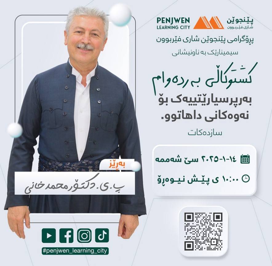 پڕۆگرامی پێنجوێن شاری فێربوون کۆڕێکی گشتی بۆ بەڕێز (پ.ی.دکتۆر محمدخانی) ڕێکدەخات، بەناونیشانی (فێربوونی بەردەوام کلیلی پێشکەوتن)تێبینی: هاتن بۆ هەموانە.شوێن: پێنجوێن - هۆڵی بۆنەکان.ڕۆژ: یەک شەممەبەرواری: ١٥-١٢-٢٠٢٤.کات: ١:٣٠ پاش نیوەڕۆ.