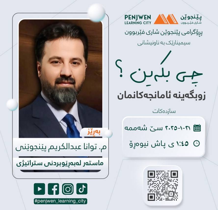 لەدرێژەی کاروچالاکییەکانی پڕۆگرامی پێنجوێن شاری فێربوون ، ڕێکەوتی ٢١-١-٢٠٢٥ سیمینارێک بۆ بەڕێز (م. توانا عبدالکریم پێنجوێنی) خاوەنی بڕوانامەی ماستەر لە بەڕێوەبردنی ستراتیژیدا، ساز دەکرێت بەناونیشانی (چی بکەین زوبگەینە ئامانجەکانمان؟).هاتن بۆ هەموانە.ڕۆژ: سێ شەممەڕێکەوتی: ٢١-١-٢٠٢٥کات: ١:٤٥ی پاش نیوەڕۆشوێن: کتێبخانەی گشتی پێنجوێن نهۆمی دووەم.