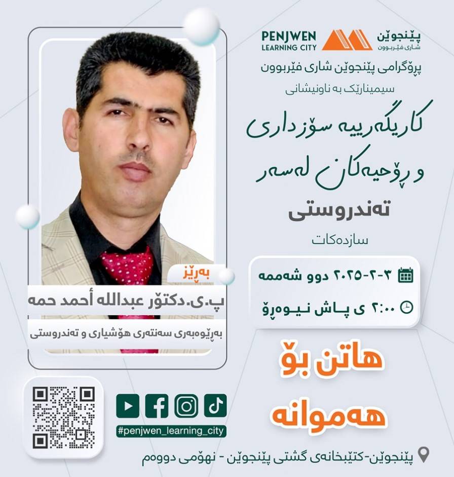 "کاریگەرییە سۆزداری و ڕۆحییەکان (خۆشەویستی، لێبوردەیی، ڕق و توڕەبوون) لەسەر تەندروستی"... ئەمە ناونیشانی سیمینارێکی گرنگ و پێویستە لەلایەن بەڕێز پڕۆفیسۆری یاریدەدەر دکتۆر(عبداللە ٲحمد حمە) مامۆستای زانکۆ و بەڕێوەبەری سەنتەری هۆشیاری تەندروستی لە پارێزگای سلێمانی لەپێنجوێن ئەنجام دەدرێت.هاتن بۆ هەموانە..بەروار: ٣-٢-٢٠٢٥ڕۆژ : دوو شەممەکات: ٢:٠٠ی پاش نیوەڕۆ.شوێن: کتێبخانی گشتی پێنجوێن.