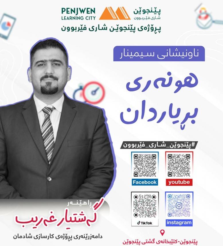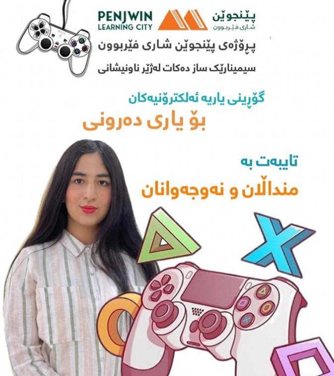 پڕۆژەی پێنجوێن شاری فێربوون سیمینارێکی تایبەت بە منداڵان و نەوجەوانان، بۆ بەڕێز (هەتاو عزیز) بە ناونیشانی (گۆڕینی یاریە ئەلکترۆنیەکان بۆ یاری دەرونی) سازدەکات، بەمەبەستی هۆشیار کردنەوەی چینی نەوجەوانان و منداڵان لە و گرفت و کێشانەی کە لە ئەنجامی زۆر بەکارهێنانی یاریە ئەلکترۆنیەکانەوە ڕوبەڕویان دەبێتەوە.شوێن : کتێبخانەی گشتی پێنجوێن - نهۆمی دووەم.کات : ۹ ی پێش نیوەڕۆ ڕۆژ : ١٠-٩-٢٠٢٤ سێ شەممە