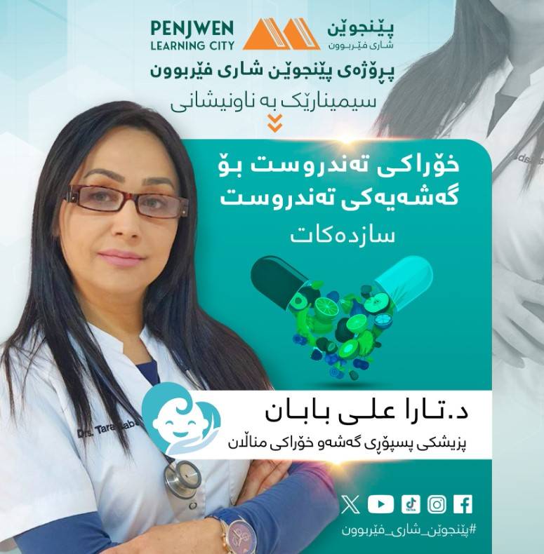 بەمەبەستی پەروەردەکردنی نەوەیەکی تەندروست، دوور لە نەخۆشی و ناخۆشی، هاوکات بۆ دورکەوتنەوەی منداڵان لە خواردنی هەندێک خۆراکی نا تەندروست و ڕێنماییکردن و ئاگادارکردنەوەی دایبابان لە زەرەرو زیانی ئەو خۆراکە ناتەندروستانەی کە دەیدەن بە منداڵەکانیان،(پڕۆژەی پێنجوێن شاری فێربوون) سیمینارێکی تایبەت و جیاواز بۆ بەڕێز(د.تارا علی بابان) پزیشکی پسپۆڕی گەشە و خۆراکی منداڵان، بە ناونیشانی (خۆراکی تەندروست بۆ گەشەی تەندروست) سازدەکات.تێبینی : هاتن بۆ هەموانەبەرواری : ١٢-١٠-٢٠٢٤ .ڕۆژی : شەممە .کات : ١:٣٠ خولەکی پاش نیوەڕۆ .شوێن : کتێبخانەی گشتی پێنجوێن - نهۆمی دووەم.