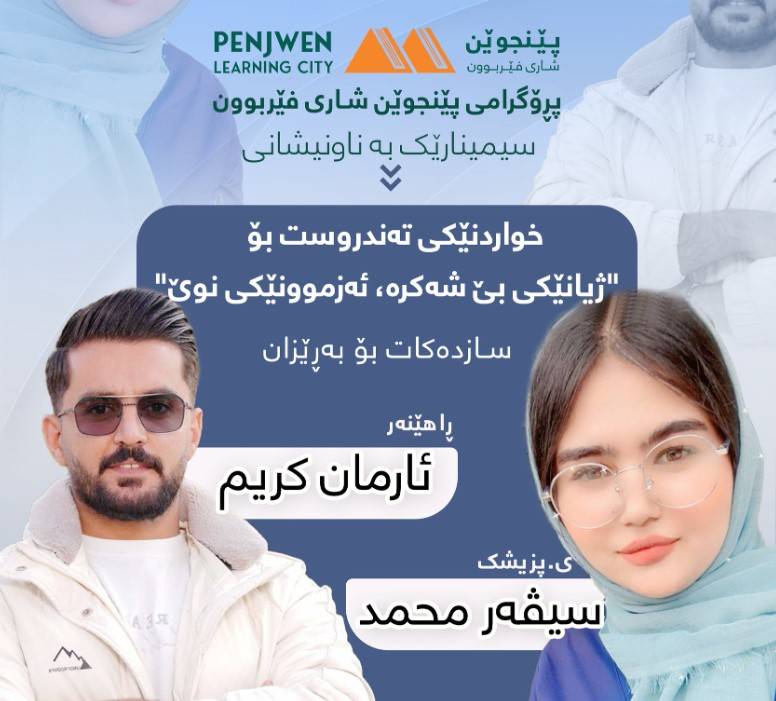بەمەبەستی هۆشیارکردنەوەی هاوڵاتیان لە شێوازی هەڵبژاردنی خواردنی ڕۆژانە و بەدوربوونیان لە نەخۆشی شەکرە، پڕۆگرامی پێنجوێن شاری فێربوون هەڵدەستێت بەسازدانی سیمینارێک لەژێر ناونیشانی (خواردنێکی تەندروست بۆ "ژیانێکی بێ شەکرە، ئەزموونێکی نوێ") بۆ بەڕێزان (ڕاهێنەر ئارمان کریم و یاریدەدەری پزیشکسیڤەر محمد).تێبینی: هاتن بۆ هەموانە.بەرواری سیمینار: ١٤-١٢-٢٠٢٤ڕۆژ : شەممەکات : ٢ی پاشنیوەڕۆشوێن : کتێبخانەی گشتی پێنجوێن - نهۆمی دووەم